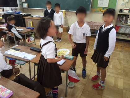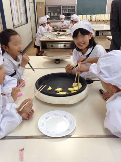 2年生は、生活科の時間に、先日学習園で収穫したさつまいもを調理して、おいもパーティーを楽しみました。家庭科室で、小さく切ったさつまいもを、ホットプレートで焼き、塩を少しふりかけて一口サイズの焼きいものできあがりです。「おいしい!」「甘い!」と子どもたちは自分たちが育てたさつまいもを味わい深く食べていました。たくさんできた焼きいもは1年生におすそ分けして、食べてもらいました。1年生のみんなにも好評でしたよ。