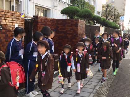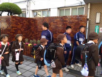 朝、校門に立ち、登校してくる児童に元気よく挨拶をしました。