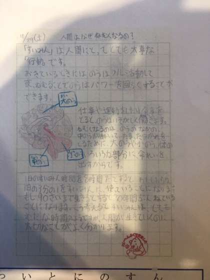 今月の校長先生賞は、3年生の「人間はなぜねむるの」という自主学習が選ばれました!
