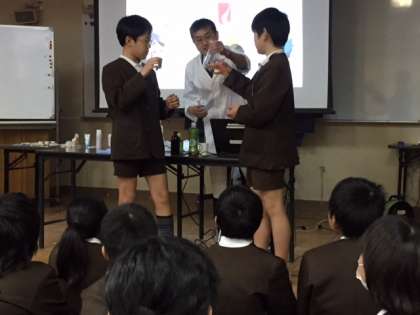 はじめに、実験で、水やお茶、ジュースなどを使って薬がどのように溶けるのか実験を行いました。