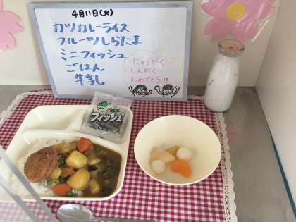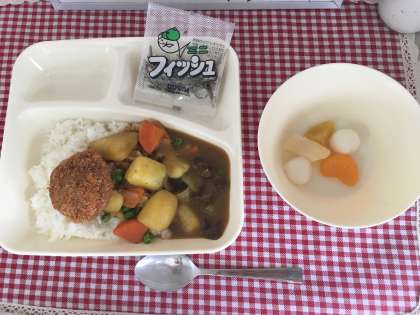 カツカレーライス、ミニフィッシュ、フルーツ白玉、牛乳でした。