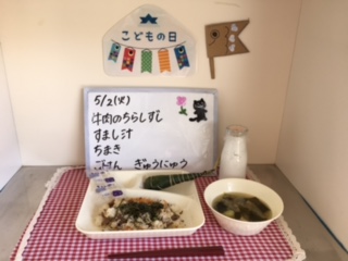 今日の給食は「子どもの日」行事献立で、牛肉のちらしずし、すまし汁、ちまき、牛乳でした。