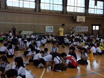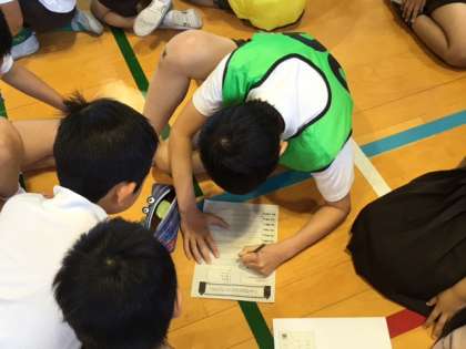 講堂にたてわり班ごとに集まり、集会委員が出題するクイズの答えをみんなで相談していました。みんなで楽しく活動できましたね!