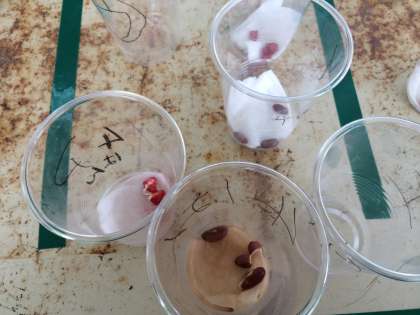 カップに種を入れて、様々な条件のもとで発芽するかどうかを観察しています。