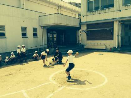 午前中は、低・中学年がスポーツテストに取り組み、ソフトボール投げや