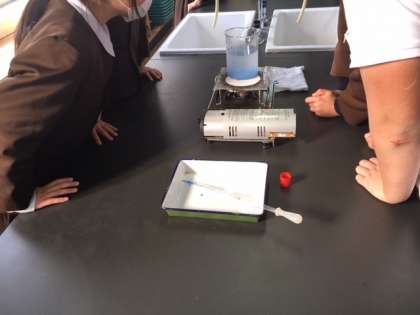 鉄の温まり方を学習した後、今日は、水の温まり方について実験しました。