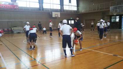 プロバスケットチーム「大阪エヴェッサ」の選手、コーチに来ていただき、バスケットボールを教えてもらいました。ドリブル、シュートのコツを聞いたあと練習しました。
