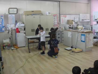 1年生は聴力検査を行いました。まずは先生たちがお手本を見せてくれました。「ピー」という音が聞こえたら手を挙げて、自己申告します。自分の検査だけでなく、お友だちの検査中も静かに待つことができていました。