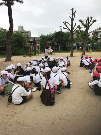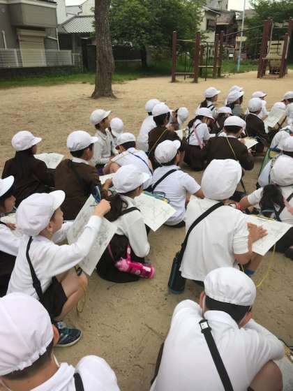 3年生は校区たんけんに行きました。田辺小学校の校区をみんなで歩いて回りました。この活動を通して「校区にどんな施設があるか」を知る学習ができました。山坂神社や商店街などいろいろなところを歩きました。