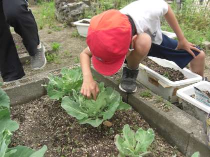 3年生は、理科で昆虫について学習をします。写真は学習園のキャベツに産み付けてあるモンシロチョウの卵を探している様子です。卵を見つけたら教室に持ち帰り「卵」「幼虫」「さなぎ」「成虫」の流れを観察します。この学習を通して、理科的視野が広がるだけでなく、生命尊重の心情も養うことができます。
