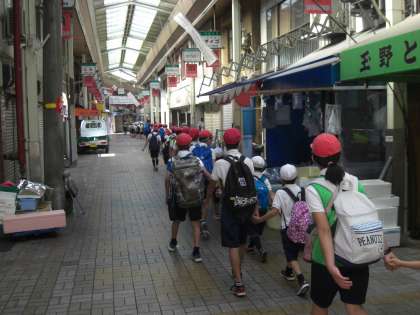 長居公園まで安全・安心に行くために、1年生は6年生とペアになって行きます。また、商店街や歩道の多い道を通ります。目的地に着くまでに「暑いな〜」とつぶやく子がいました。今日は快晴で、気温も高くなりそうです。水分をこまめにとりながら活動したいと思います。