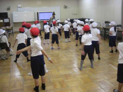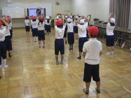 6月12日(火)から、待ちに待ったプール水泳がはじまります。田辺小学校には、プール用の準備運動として「田辺体操」というものがあります。写真は、1年生がその体操を練習している様子です。1年生のみなさん。しっかり覚えて、安全に楽しく活動しましょう。