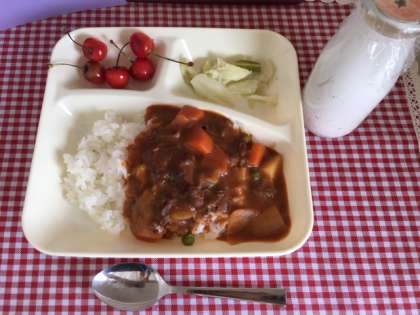 子どもたちも、「おいしい!」「学校のハヤシライス大好き!」と言って、たくさん食べていました。あるクラスでは、おかわりの列が廊下までのびるほど大人気でした!