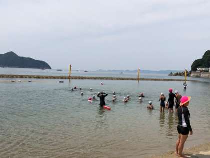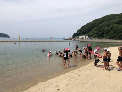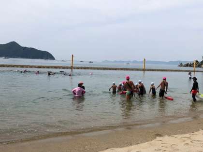 いよいよ遠泳開始です。今年は、3班4班から泳ぎます。完泳するぞ!