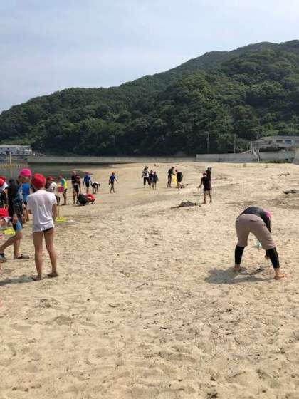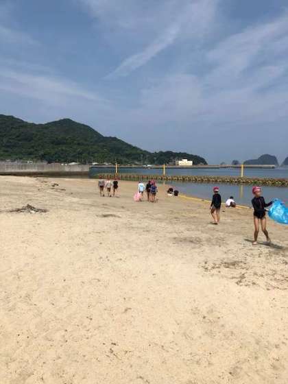 浜遊びも無事に終わり、お世話になった浜の掃除をしています。