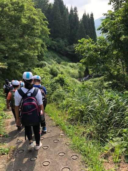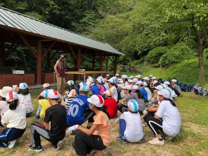 カレー作りのために場所を移動して、説明を聞いています。いよいよカレー作りです。どんなカレーになるか楽しみです。