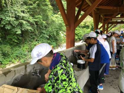 片付けを終えて、次の魚つかみの場所に移動します。お茶の補給もしています。