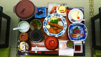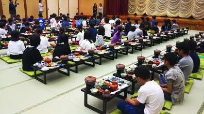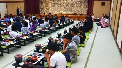 待ちに待った夕食です。食事係さんのあいさつでモグモグ食べ始めました。