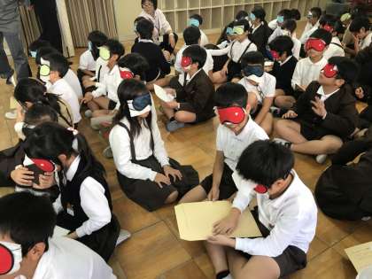 視覚障がいの方への声がけの仕方や案内の仕方を教えていただき、自分たちもアイマスクをして、点字の絵をさわる体験もしました。