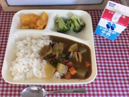 毎回子どもたちに大人気のカレーライス。今日は、牛肉、玉ねぎ、にんじんのほか、大根、れんこんを使った冬野菜のカレーライスにしました。大根やれんこんの食感が好評でした。