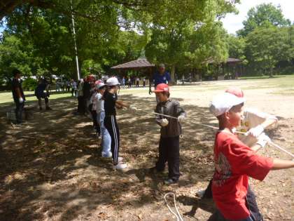 クラスごとに分かれて火起こしの体験です。みんなの力を合わせて火を起こしていきます。