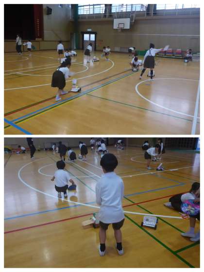 2年生の生活科の学習の様子です。風を利用して進む車を作って体育館で動かして遊んでいました。風を受ける帆を工夫して作っていました。