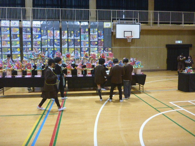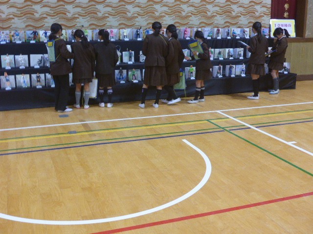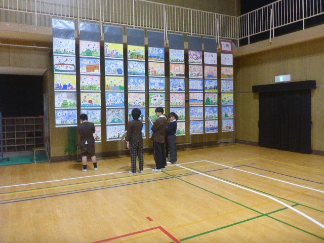 作品展の鑑賞の様子です。他学年の作品を見ることは子どもたちの感性を育てることにもつながります。子どもたちはひとつひとつの作品をじっくりとみて、好きなところ、がんばっているところなどを見つけていました。