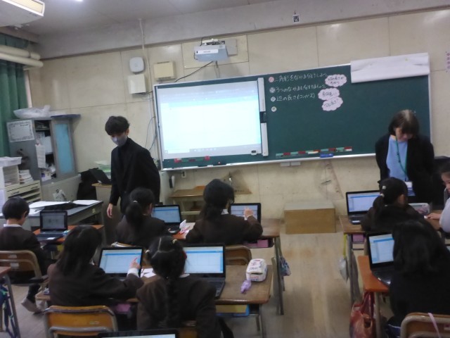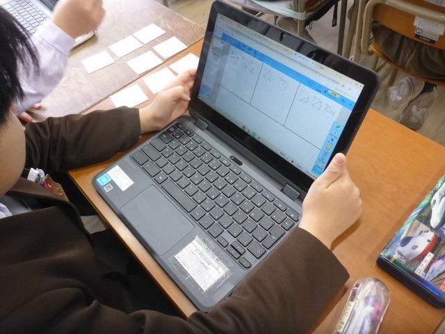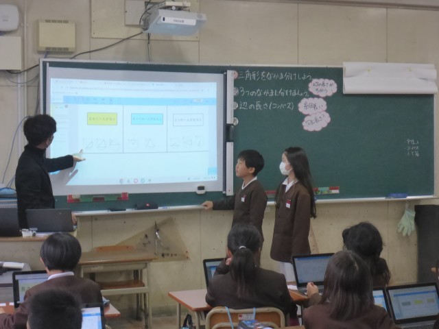 3年生の算数科の学習の様子です。三角形を辺の長さに注目して仲間分けをするという内容です。学習者用端末を活用して、自分たちで作成した三角形を仲間分けし、発表しました。また、この授業は、大阪市総合教育センターより講師に来ていただき、授業についてのアドバイスをいただきました。