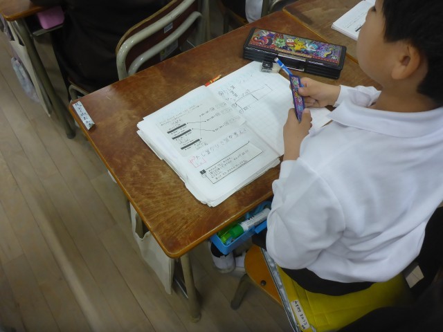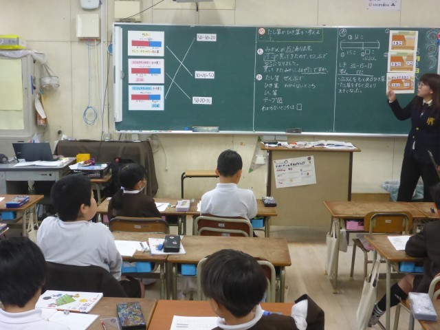 2年生の算数科の学習の様子です。わからない数値を□に置き換えて求める問題です。問題の場面に応じてテープ図を書き、式を立てていきます。ひき算になる理由を言葉で考えるのが難しいですががんばって考え発表していました。