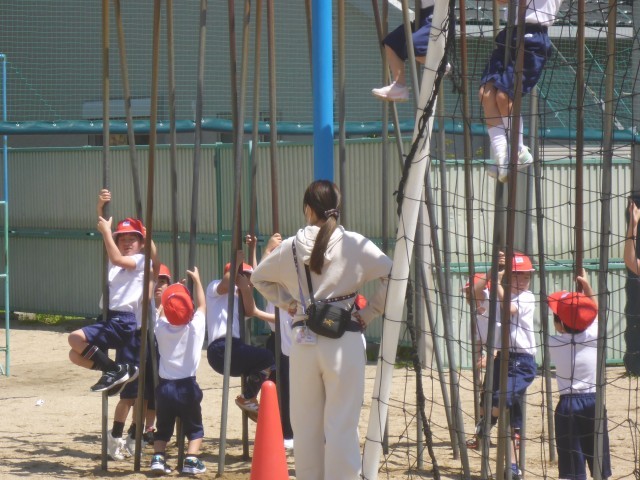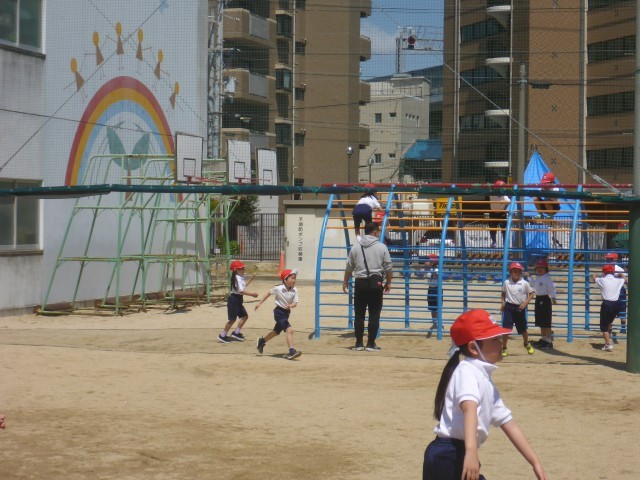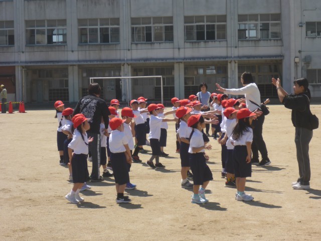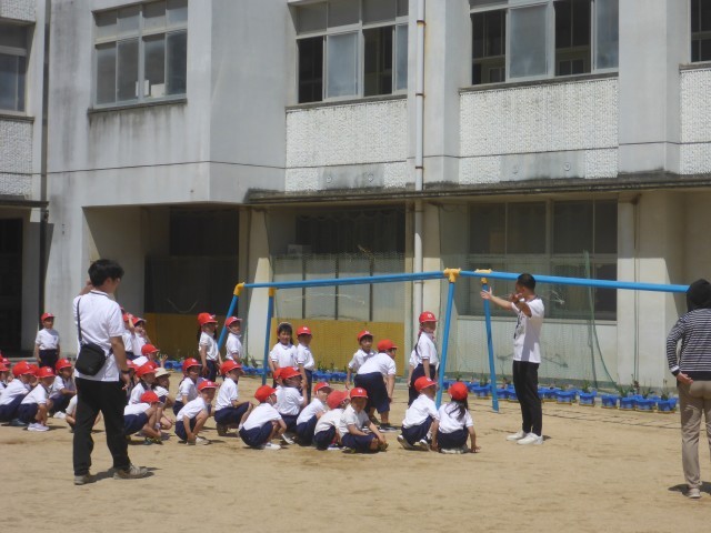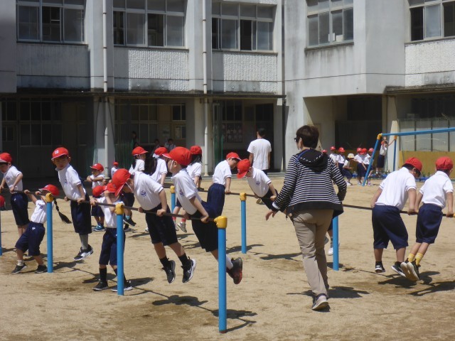 1年生の体育科の学習の様子です。整列の練習やいろいろな遊具を使っての運動に取り組んでいました。
