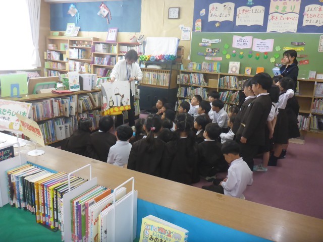 1年生が図書の時間に学校司書から読み聞かせをしてもらっている様子です。子どもたちは、どんどんと絵本の世界に引き込まれている様子でした。