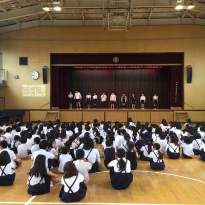 児童集会で、児童会の前期代表委員の発表がありました。