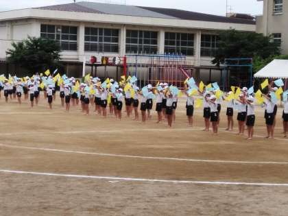 お手紙でもおしらせしておりますが、運動会当日は暑くなることが予想されますので、昼食時(12時〜13時)に講堂を開放します。ぜひ、ご利用ください。なお、多くの方が利用されることが予想されますので、お互いに譲り合って利用してください。また、講堂へは上靴が必要ですので、ご利用される場合は持参してください。ご理解とご協力、よろしくお願い致します。(写真は5・6年生の団体演技の練習風景です。)