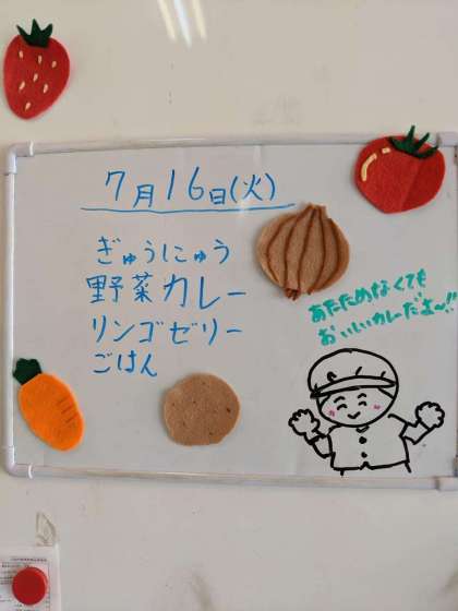 今日の給食は『野菜カレー』『りんごゼリー』でした。