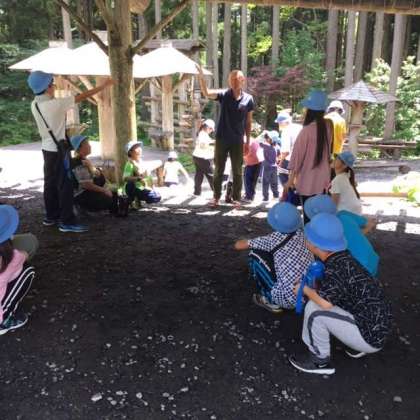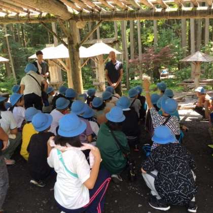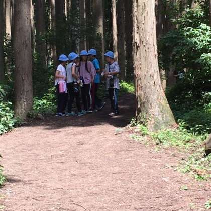 宿舎裏の森のアスレチックで、6つの食材名を書いたカードを探します。