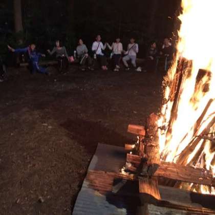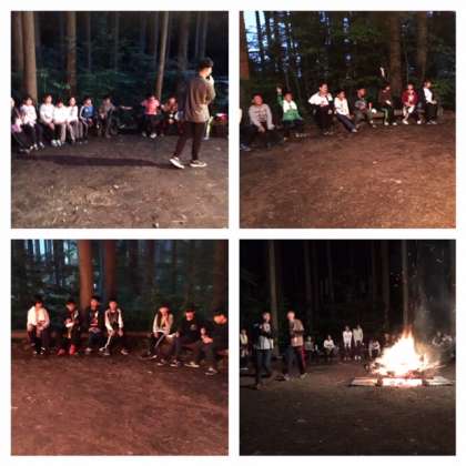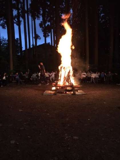 7時からは、キャンプファイヤです。全員元気に参加しています。火の神から火を授かり、その炎の明かりを囲んで、様々なリクレーションを行なっています。どんどん盛り上がっていて、みんな笑顔で楽しんでいます。