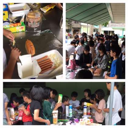 朝食はカートンドッグを自分たちで作って食べました。小雨も止んで、予定通り広場で行うことができました。