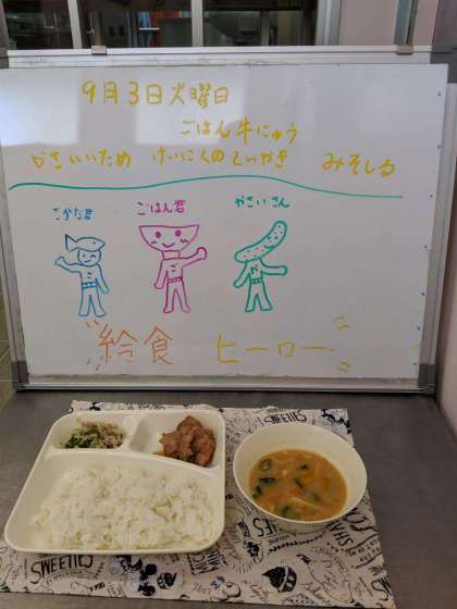 今日の献立ボードは給食委員会の子どもたちが考えた給食ヒーローです。