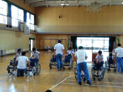 大阪市心身障がい者リハビリテーションセンターの方々に来ていただき、車いすの押し方や操作方法などについて学習しました。実際に車いすに交代で乗って、グループの友だちに押してもらうなどして体験もしました。 車いすに乗る人の気持ちになって操作することが大事であることを学ぶことができました。リハビリテーションセンターの皆様、ご指導ありがとうございました!!