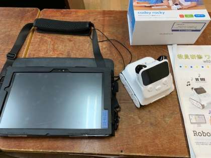 放課後に、教職員がプログラミング教育の研修を受けました。ロボットカーを動かすプログラムをタブレット端末に入力したり、実際に動かしたりしました。