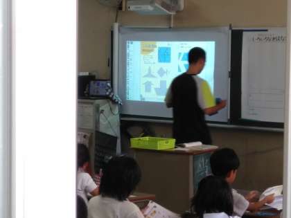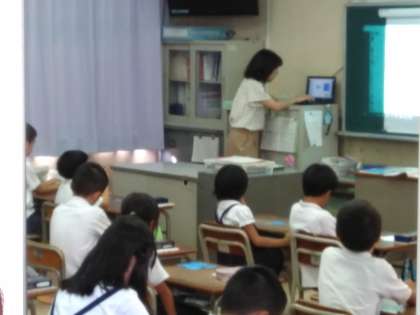 2年生と4年生の学習参観が行われました。2年生は算数(図形)の学習でした。形の敷詰めをパソコンの画面を見ながら実際に作業しながら学習していました。子どもたちは真剣に学習に取組んでいました。