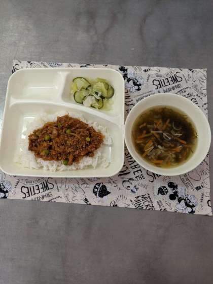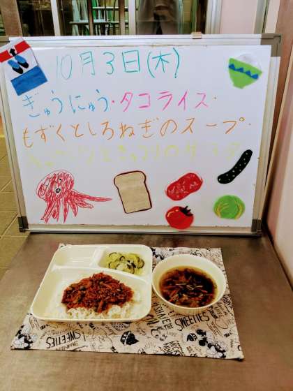 今日の給食は『タコライス』『もずくと白ネギのスープ』『キャベツときゅうりのサラダ』でした。
