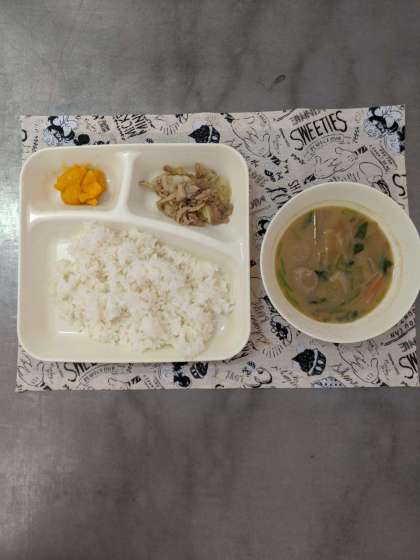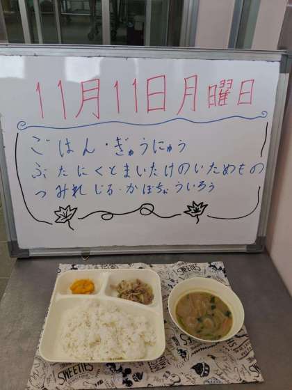 今日の給食は『豚肉とまいたけのいためもの』『つみれ汁』『かぼちゃういろう』でした。