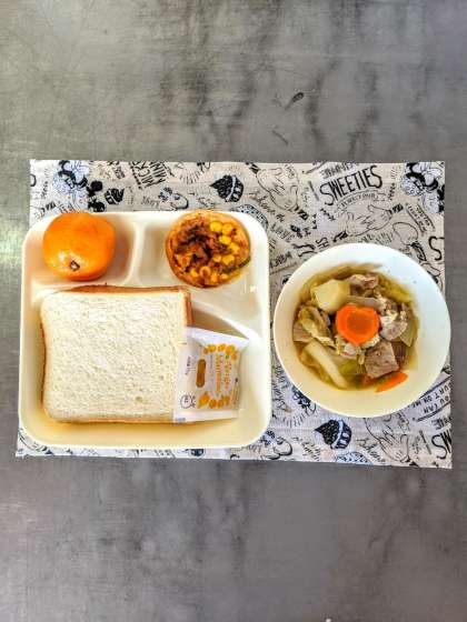 今日の給食は『豚肉とキャベツのスープ煮』『変わりピザ』『みかん』でした。