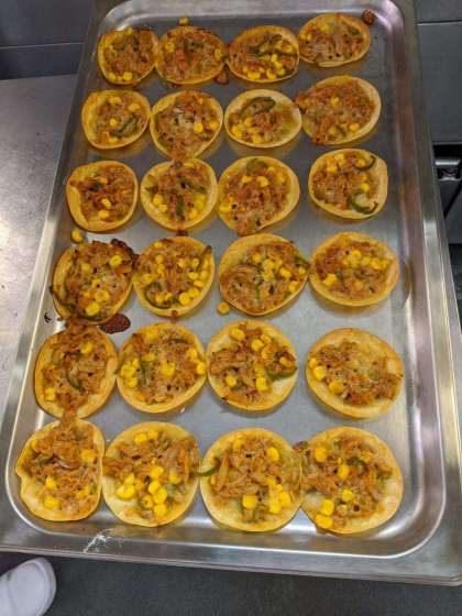 変わりピザは、ツナ、コーン、ピーマン、ピザソース、チーズを混ぜ合わせ、ぎょうざの皮にのせ、焼き物機で焼きます。