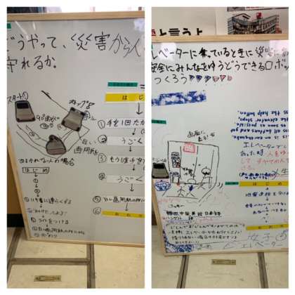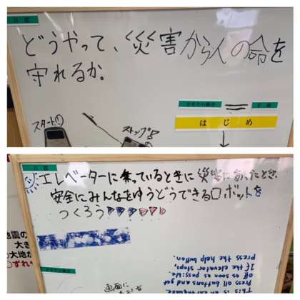 「がんばる先生支援」研究発表会で行った6年生の研究授業では、子供たちが自分で考えた災害対策をプログラミングロボットを使いながら試したり、人に説明したりしました。