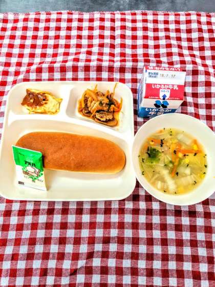 今日の給食は『豚肉のケチャップソテー』『コーンスープ』『焼きプリン』でした。