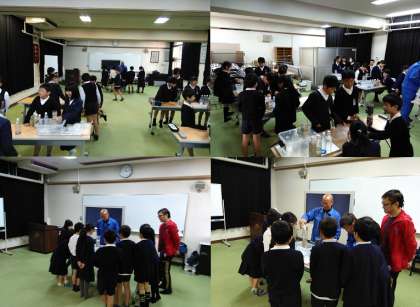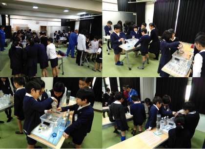 大阪市水道局の方による4年生の出前授業が多目的室で行われました。水道の仕組みについて詳しくお話ししていただいたあと、水が浄化される仕組みをペットボトルなどの身近な道具を使って実験するなど、楽しみながら学習することができました。