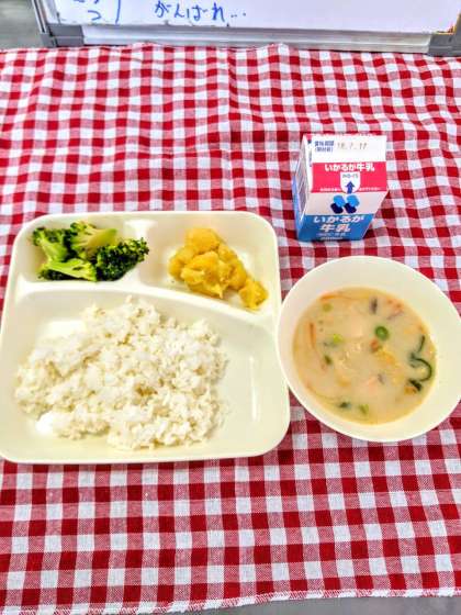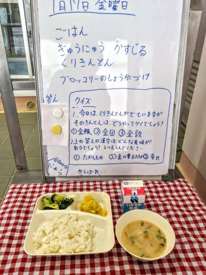 今日の給食は『かす汁』『ブロッコリーのしょうがづけ』『くりきんとん』でした。