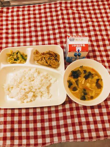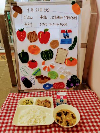 今日の給食は『豚肉のごまだれ焼き』『みそ汁』『きくなとはくさいのおひたし』でした。